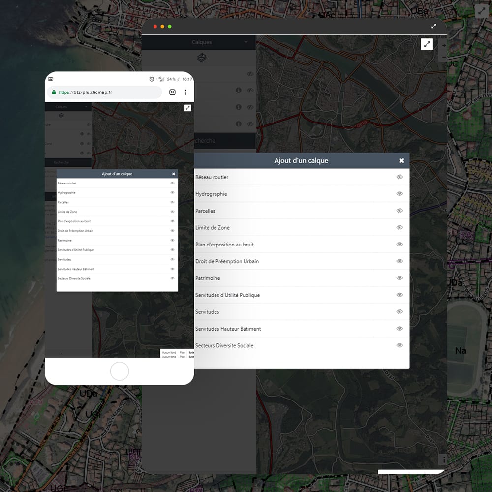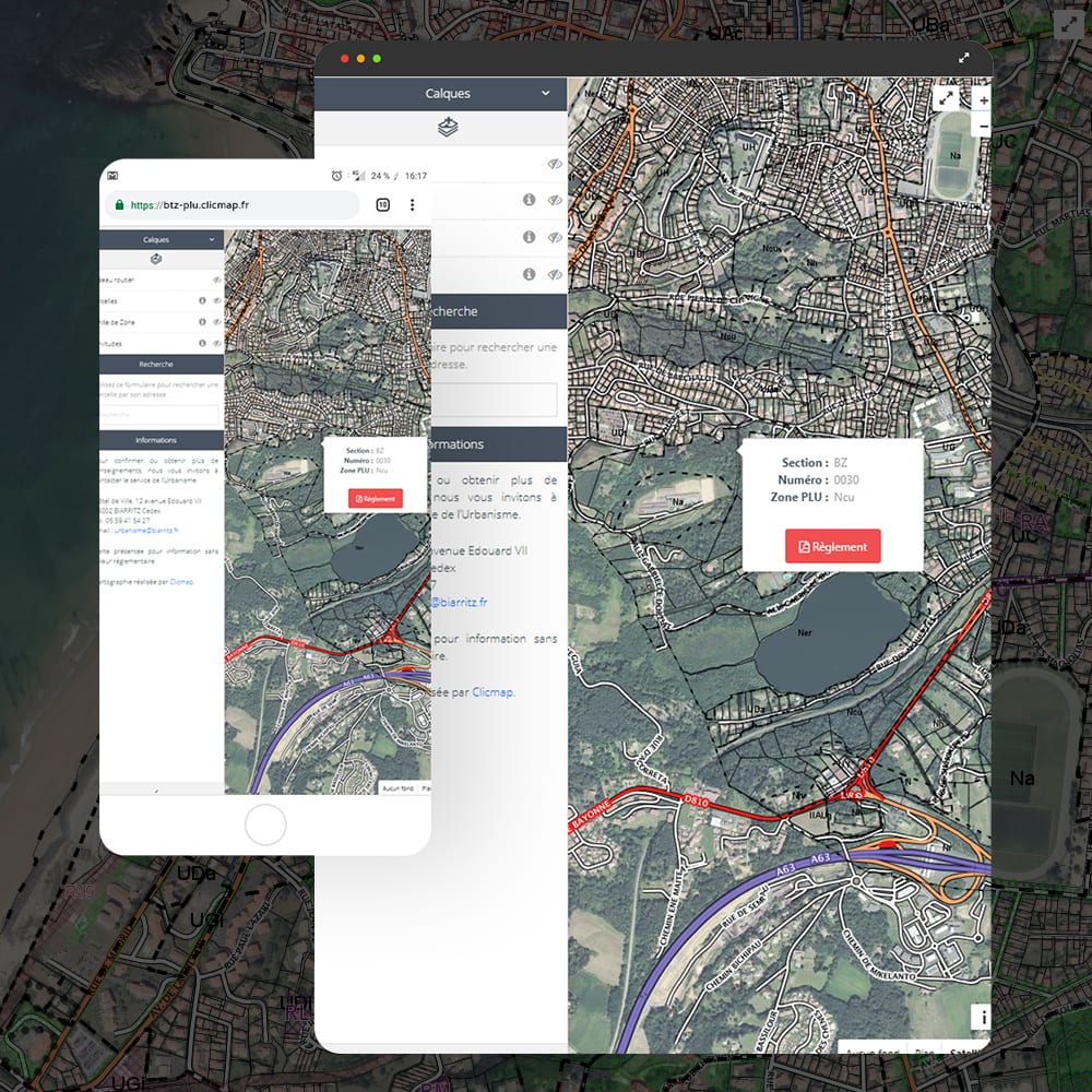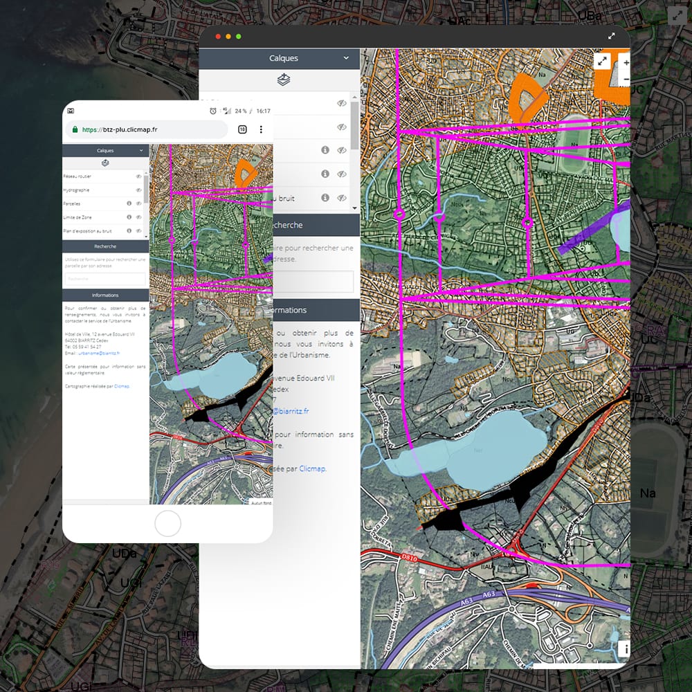 Pour ce projet, nous avons réalisé une interface graphique permettant de consulter facilement le PLU en ligne avec différents niveaux de lecture grâce à des calques présentant l’ensemble des données de la ville (parcelles, réseaux routiers, hydrographie, servitudes, patrimoine, etc.).