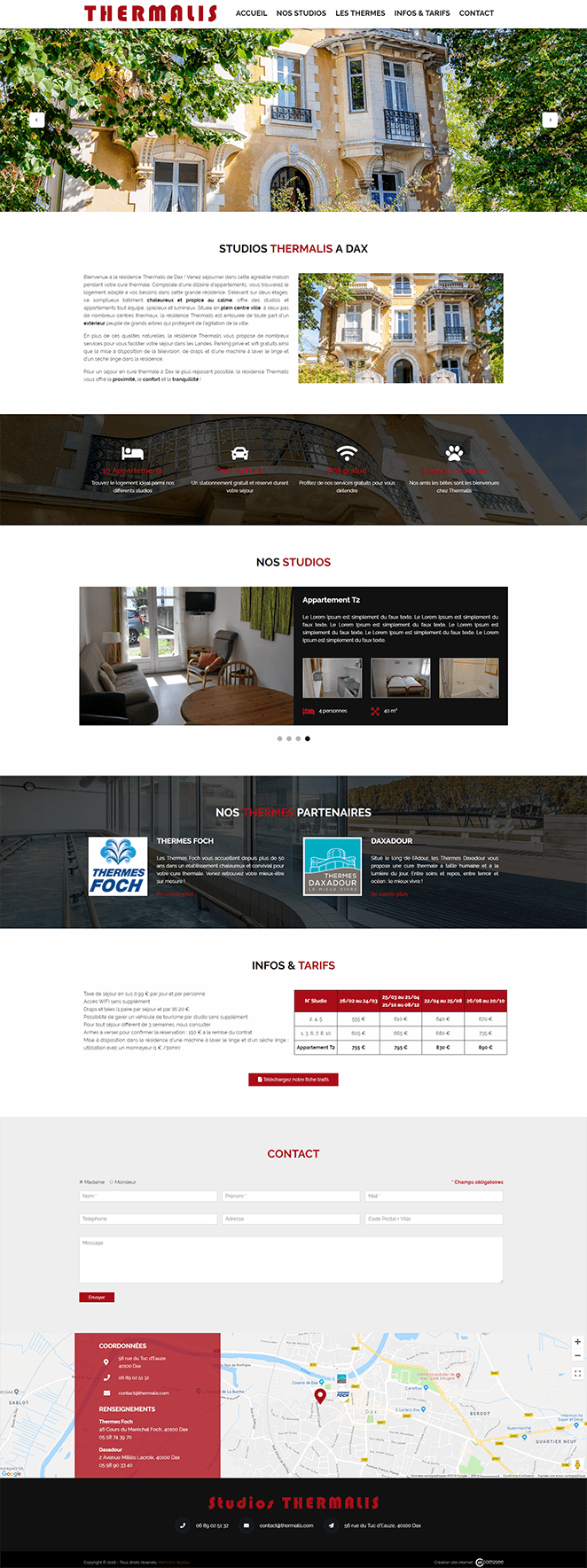 Le client tenait a avoir un site sous format onepage, c’est-à-dire que toutes les informations sont présentées sur la seule page d’accueil. Pour rassembler toutes les informations, et notamment présenter l’ensemble des studios et appartements, nous avons travaillé la mise en page pour garder une expérience utilisateur simple malgré la quantité d’informations.